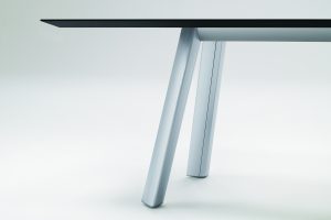 With the simplicity found in the brush strokes of Japanese calligraphy as its starting point, the Traverse Satellite built upon the silhouette of the original Traverse Conference Table. Traverse Satellite is a mid-sized table collection featuring rectangular and round top options in a variety of sizes and materials that include glass, Corian, wood veneer and laminate. The original table’s diagonal wood sawhorse legs inspire the new version’s sleek diagonal legs that are available in painted and brushed anodized aluminum.