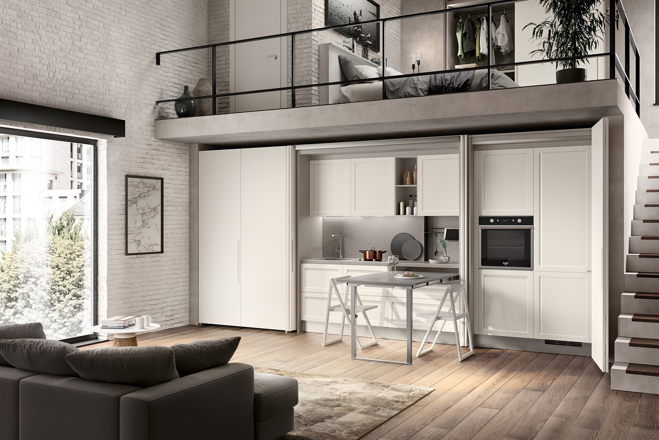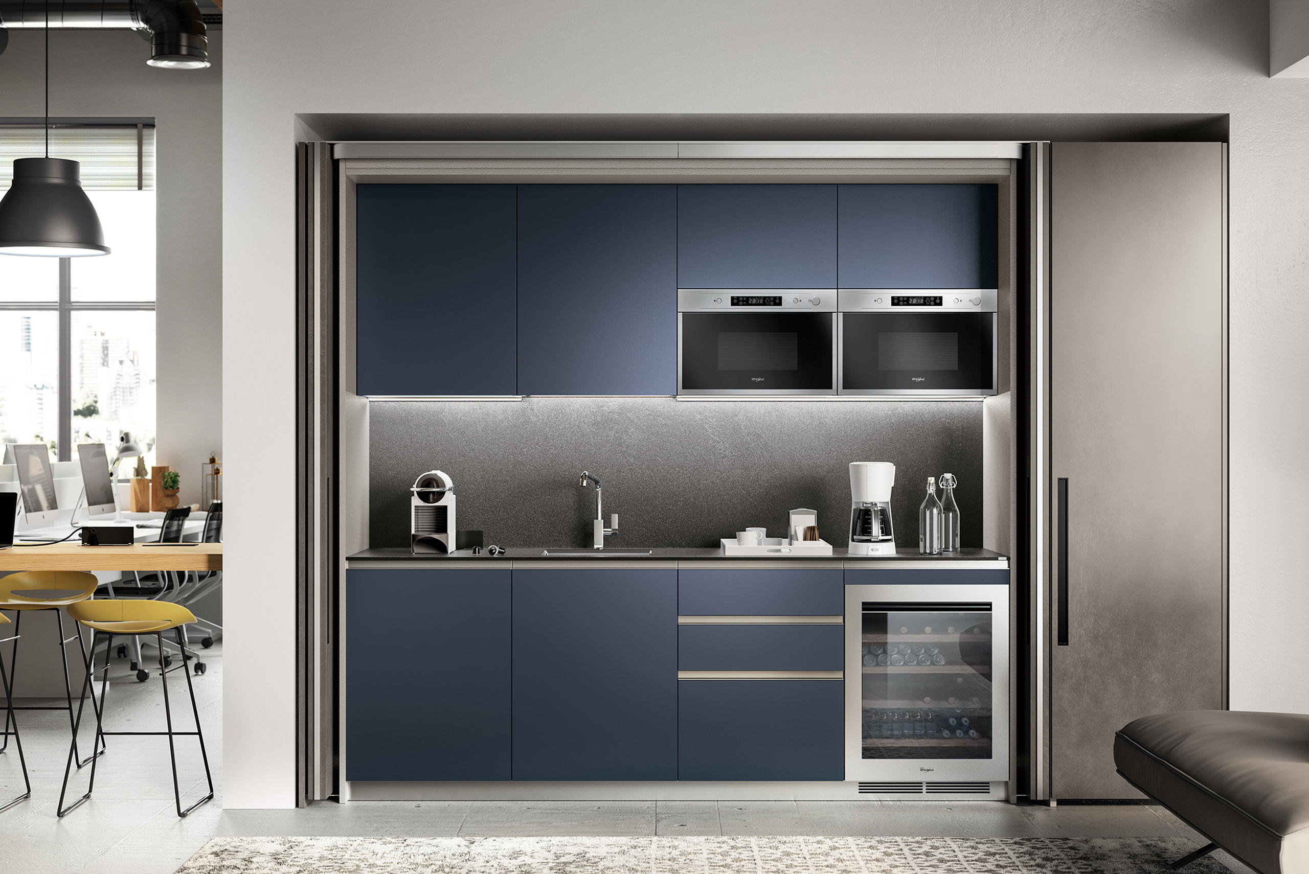 Its modular design responds to a variety of settings. Boxlife’s cupboards have retractable doors to allow for unencumbered use. The kitchen unit can house up to four appliances, an additional sliding worktop, multiple shelves and storage drawers, making it fully functional in a compact space. Boxlife is the answer to the urban studio apartment.