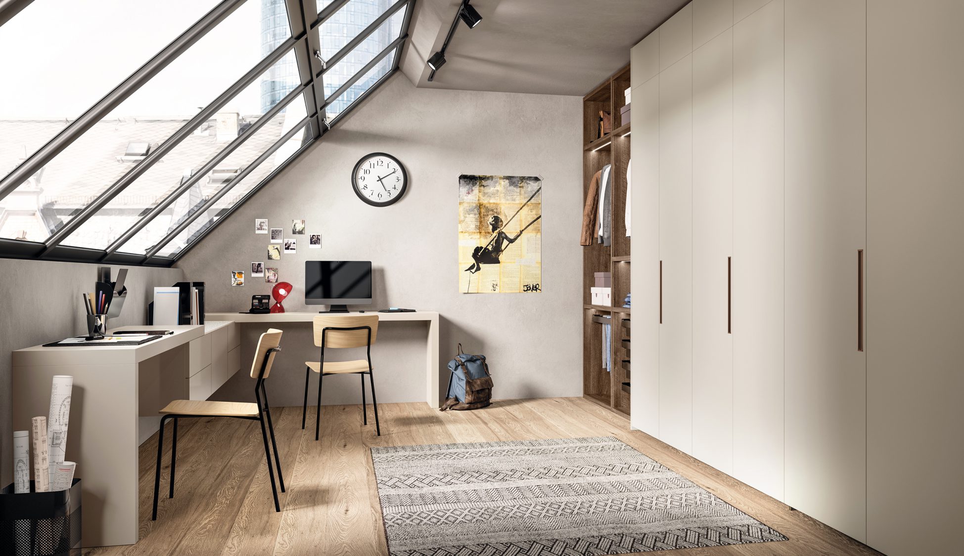 With this opportunity for configuration, the entire room becomes a transformative blueprint, able to transition from entertainment space to office to bedroom by concealing or revealing different features.